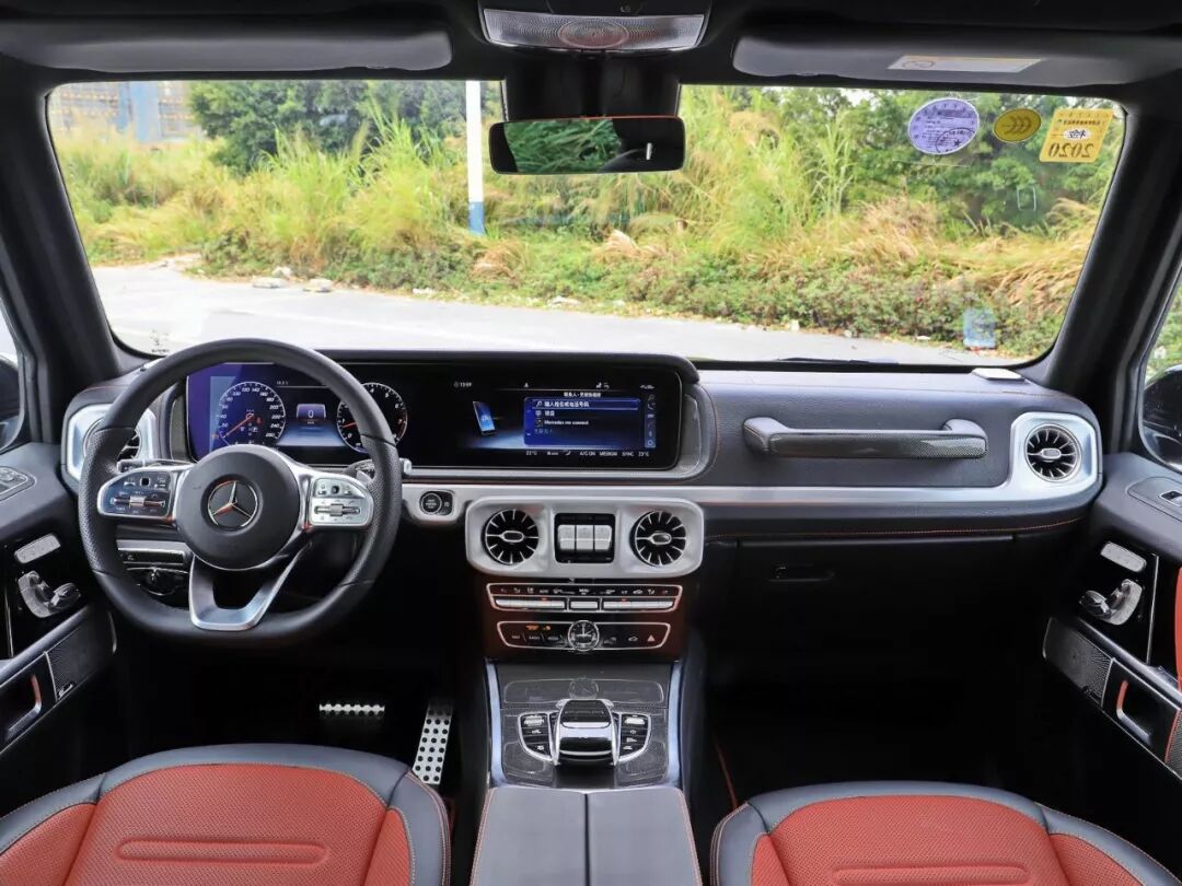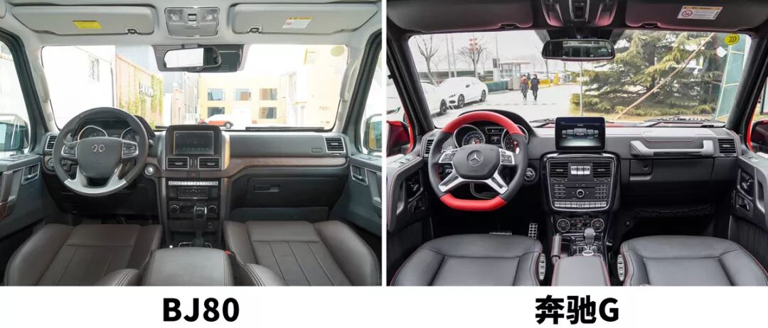 进入到内饰,如果是新款奔驰G的话,那么这个差别就一目了然了,其中在奔驰G上两块相连的12.3英寸大屏幕格外耀眼。另外空调出风口、按键的布局等等都有很大的区别,在豪华感上提升了不少。如果是老款的奔驰G,那么在一些细节的地方依然能看出和BJ80的不同,在副驾驶前方的中控台上,奔驰G依然保留了经典的把手,而且中控台上密密麻麻按键的布局也近乎是左右对称的设计,在上面你还能看到奔驰G引以为傲的三把锁按键。