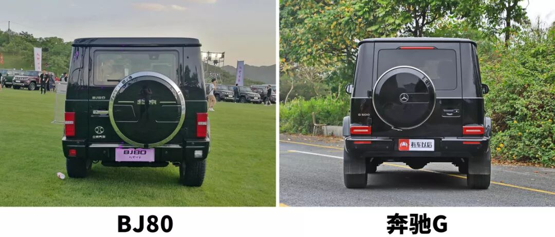 最后外观上还有一个最明显的差别就是尾部,BJ80开启尾门的门把手是位于车辆左边,因此备胎就被挪到了靠右的位置,而奔驰G与它的位置刚好相反。