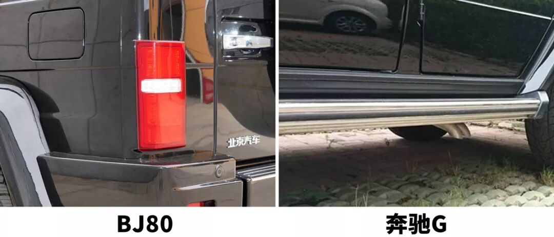 侧面用肉眼能看出来最大的区别就是北汽BJ80的油箱盖位置位于车辆的左后方,而奔驰G则位于右后方,另外排气管的位置也有所不同,BJ80是常规的将排气的尾段也就是排气口的位置设置在车尾的地方,而奔驰G则是在侧面。这些布局都是一眼就能看出来的,并且后期改装起来也比较麻烦,因为一旦改变的话,很多零部件的布局都需要调整,正所谓牵一发而动全身。
