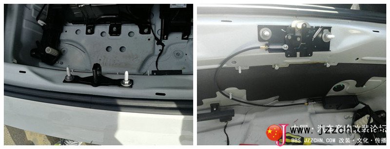 原车锁扣和改装后的自吸锁扣的对比;自吸锁扣起到锁紧尾门的作用:当关闭尾门时,自吸锁或锁扣收到闭锁信号后,可自行吸合尾门达到锁止状态